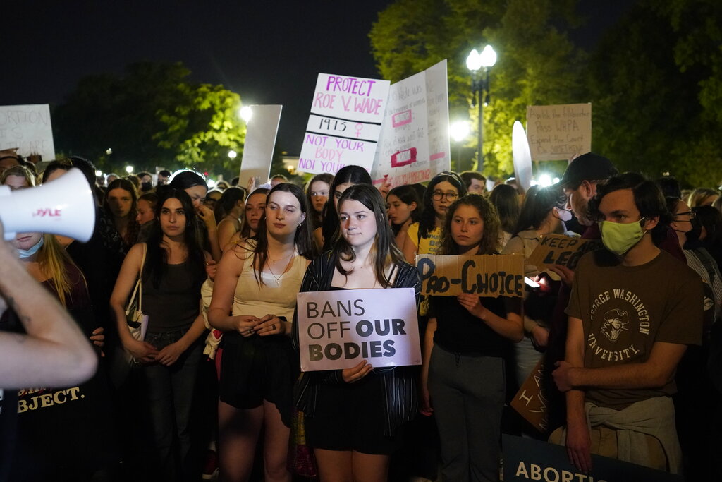A crowd of people gather outside the Supreme Court, Monday night, May 2, 2022 in Washington. A draft opinion circulated among Supreme Court justices suggests that earlier this year a majority of them had thrown support behind overturning the 1973 case Roe v. Wade that legalized abortion nationwide, according to a report published Monday night in Politico. It’s unclear if the draft represents the court’s final word on the matter. The Associated Press could not immediately confirm the authenticity of the draft Politico posted, which if verified marks a shocking revelation of the high court’s secretive deliberation process, particularly before a case is formally decided. (AP Photo/Alex Brandon)