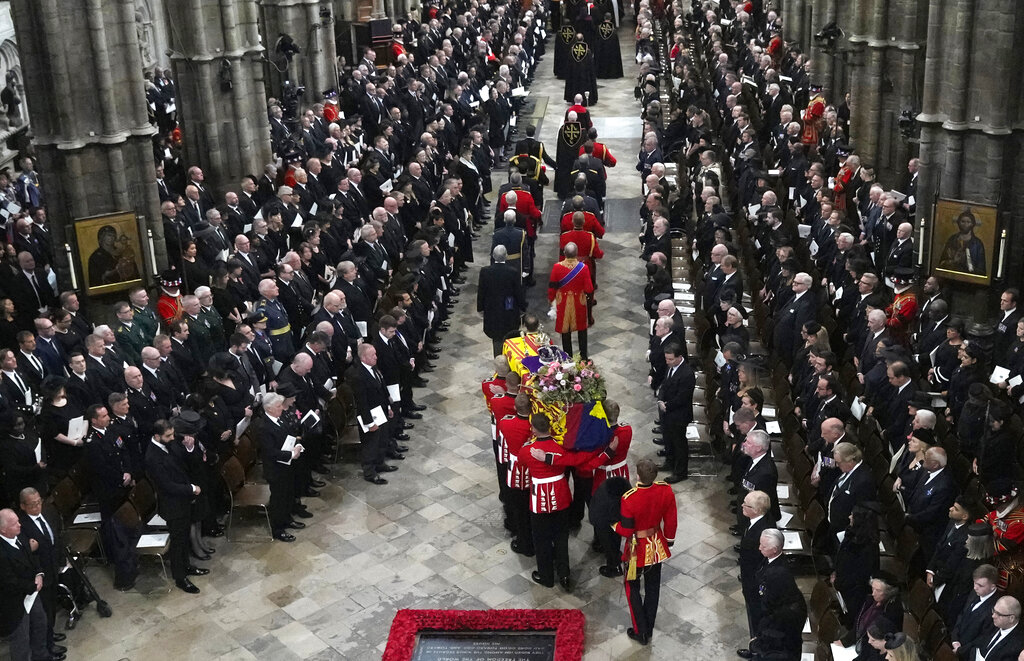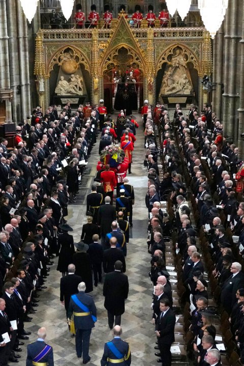 In a country known for pomp and pageantry, the first state funeral since Winston Churchill’s promised to be a spectacular display: 142 Royal Navy sailors are set to pull the gun carriage carrying Elizabeth’s coffin to Westminster Abbey, where 2,000 people ranging from world leaders to health care workers and volunteers plan to mourn her. Ahead of the ceremony, one of the Abbey’s bells is tolling 96 times — once a minute for each year of her life.