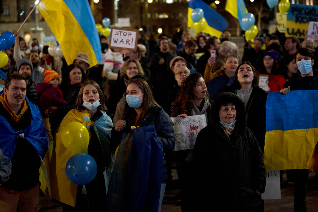 Ukranians and their supporters protest against Russia’s invasion of Ukraine, in central Jerusalem, Monday, Feb. 28, 2022. (AP Photo/Maya Alleruzzo)