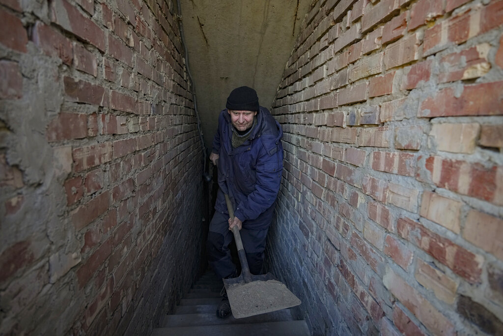 A man cleans a bomb shelter in Kyiv, Ukraine, Monday, Feb. 28, 2022. Explosions and gunfire that have disrupted life since the invasion began last week appeared to subside around Kyiv overnight, as Ukrainian and Russian delegations met Monday on Ukraine’s border with Belarus. (AP Photo/Vadim Ghirda)
