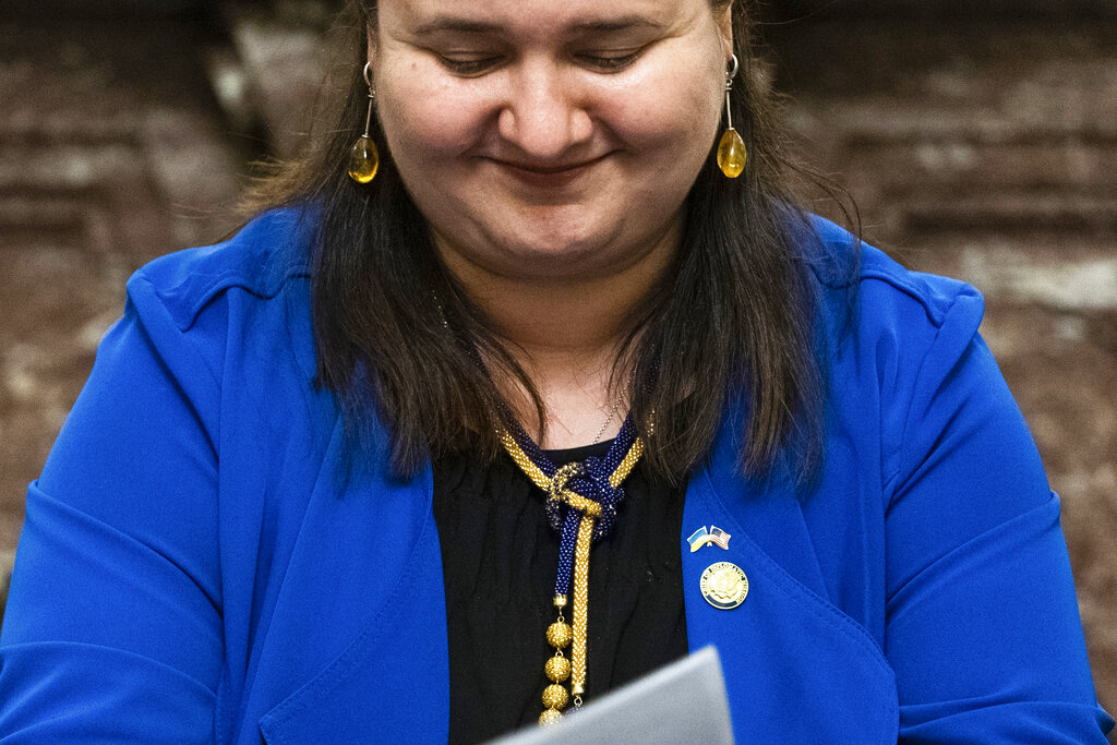 Ukrainian Ambassador Oksana Markarova wears the blue and yellow of her country’s flag at the start of a meeting with the Senate Ukraine Caucus, at the Capitol in Washington, Monday, Feb. 28, 2022. (AP Photo/Jacquelyn Martin)