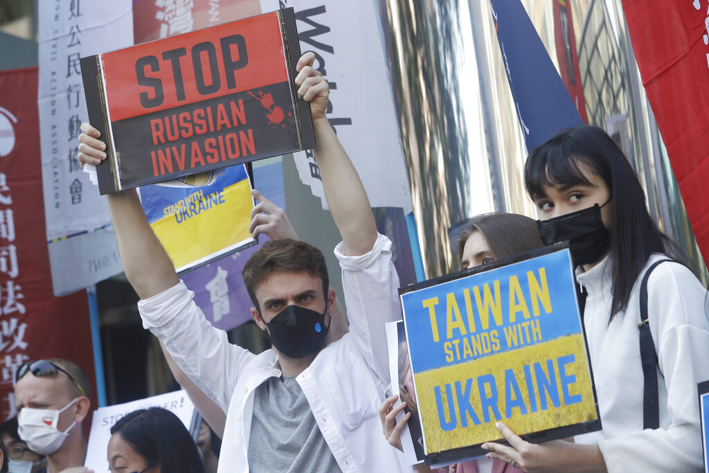 A group of Ukrainian people in Taiwan and supporters hold posters to protest against the invasion of Russia in solidarity with the Ukrainian people in front of the Representative Office of the Moscow-Taipei Coordination Commission in Taipei, Taiwan, Tuesday, March 1, 2022. (AP Photo/Chiang Ying-ying)