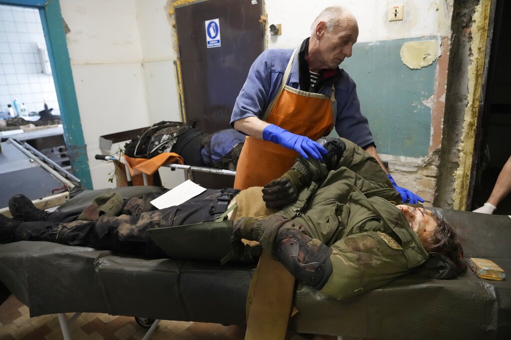 EDS NOTE: GRAPHIC CONTENT – A morgue worker looks at the body of killed volunteer of Ukraine’s Territorial Defense Forces at a hospital in Brovary, outside Kyiv, Ukraine, Tuesday, March 1, 2022. Russian shelling pounded civilian targets in Ukraine’s second-largest city again Tuesday and a 40-mile convoy of tanks and other vehicles threatened the capital — tactics Ukraine’s embattled president said were designed to force him into concessions in Europe’s largest ground war in generations. (AP Photo/Efrem Lukatsky)