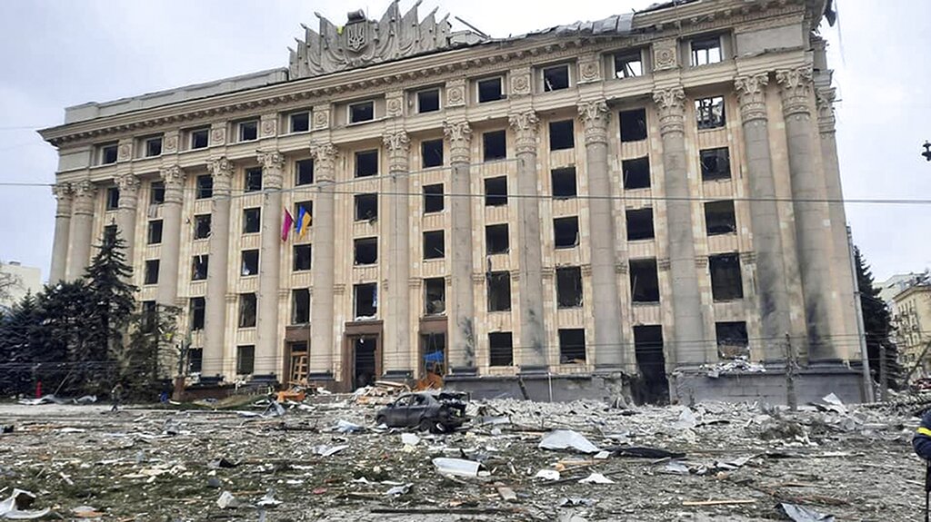 This handout photo released by Ukrainian Emergency Service shows a view of the damaged City Hall building in Kharkiv, Ukraine, Tuesday, March 1, 2022. Russian shelling pounded civilian targets in Ukraine’s second-largest city, Kharkiv, Tuesday and a 40-mile convoy of tanks and other vehicles threatened the capital — tactics Ukraine’s embattled president said were designed to force him into concessions in Europe’s largest ground war in generations. (Ukrainian Emergency Service via AP)