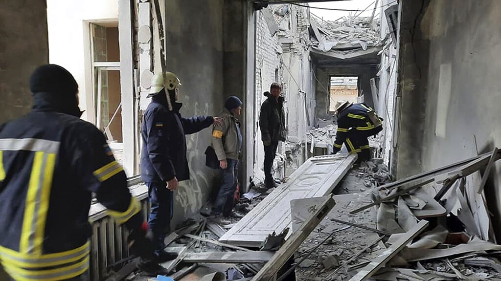 This handout photo released by Ukrainian Emergency Service shows emergency service personnel inspecting the damage inside the City Hall building in Kharkiv, Ukraine, Tuesday, March 1, 2022. Russian shelling pounded civilian targets in Ukraine’s second-largest city, Kharkiv, Tuesday and a 40-mile convoy of tanks and other vehicles threatened the capital — tactics Ukraine’s embattled president said were designed to force him into concessions in Europe’s largest ground war in generations. (Ukrainian Emergency Service via AP)