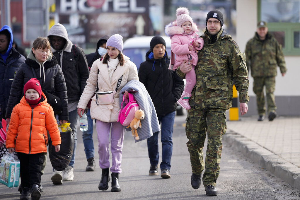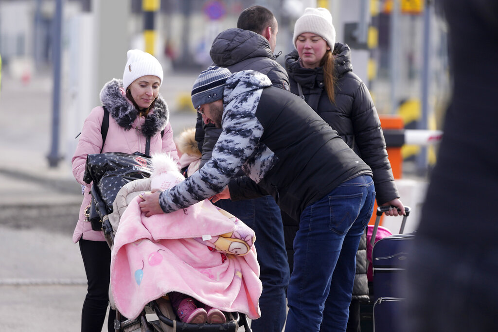 Refugees from Ukraine cross into Poland at the Medyka crossing, Tuesday, March 1, 2022. Ambassadors from dozens of countries on Monday backed a proposal demanding that Russia halt its attack on Ukraine, as the U.N. General Assembly held a rare emergency session during a day of frenzied and sometimes fractious diplomacy surrounding the five-day-old war. (AP Photo/Markus Schreiber)
