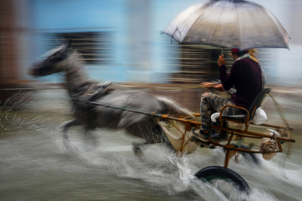 A horse pulls a buggy with passengers through a street flooded by heavy rains, in Havana, Cuba, Friday, June 3, 2022. Heavy rains have drenched Cuba with almost non-stop rain for the last 24 hours as tropical storm watches were posted Thursday for Florida, Cuba and the Bahamas as the system that battered Mexico moves to the east. (AP Photo/Ramon Espinosa)