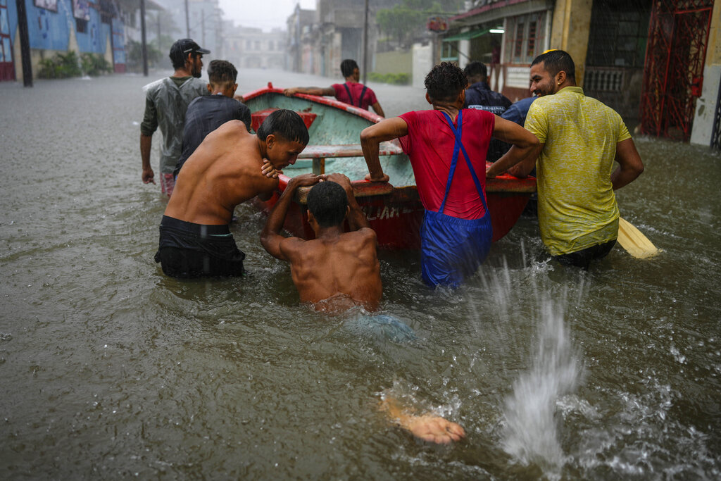 Volunteers push a boat through a street flooded by heavy rains, to go and rescue a neighbor who is unable to leave his home on his own, in Havana, Cuba, Friday, June 3, 2022. Heavy rains have drenched Cuba with almost non-stop rain for the last 24 hours as tropical storm watches were posted Thursday for Florida, Cuba and the Bahamas as the system that battered Mexico moves to the east. (AP Photo/Ramon Espinosa)