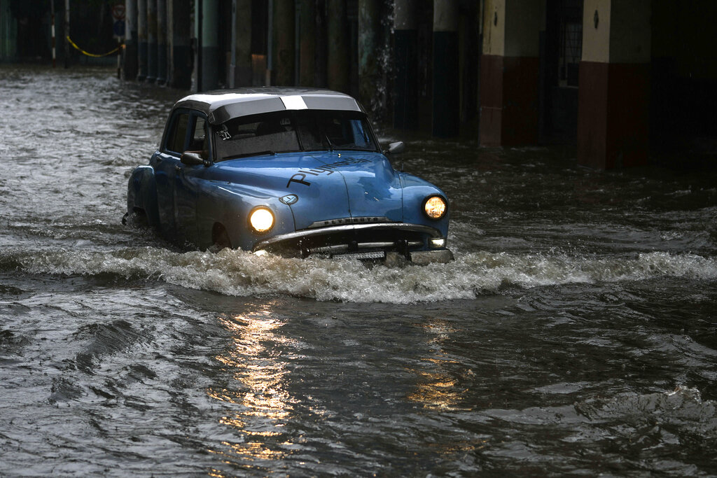A person drives a classic American car through a street flooded by heavy rains, in Havana, Cuba, Friday, June 3, 2022. Heavy rains have drenched Cuba with almost non-stop rain for the last 24 hours as tropical storm watches were posted Thursday for Florida, Cuba and the Bahamas as the system that battered Mexico moves to the east. (AP Photo/Ramon Espinosa)