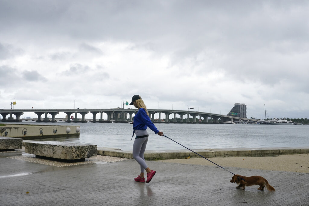 A woman walks her dog during a brief pause of heavy rain, Saturday, June 4, 2022, in Miami. A tropical storm warning was in effect along portions of coastal Florida and the northwestern Bahamas. Several Miami streets were flooded and authorities were towing abandoned vehicles. (AP Photo/Marta Lavandier)