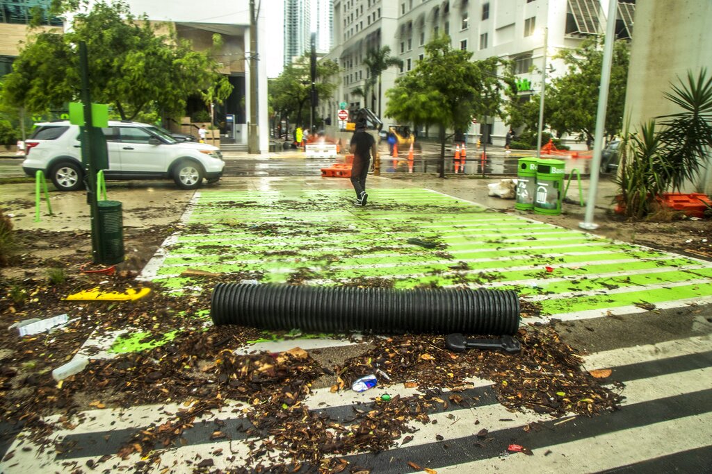 Debris litters the pavement as water levels recede after rainfall from Tropical Storm Alex caused flooding Saturday, June 4, 2022, in the Brickell area near downtown Miami. (Pedro Portal/Miami Herald via AP)