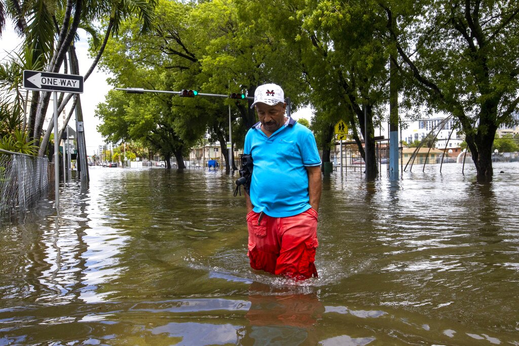 A man crosses the flooded intersection near Southwest Fourth Street and Eighth Avenue in the Little Havana neighborhood of Miami, Saturday, June 4, 2022. (Daniel A. Varela/Miami Herald via AP)