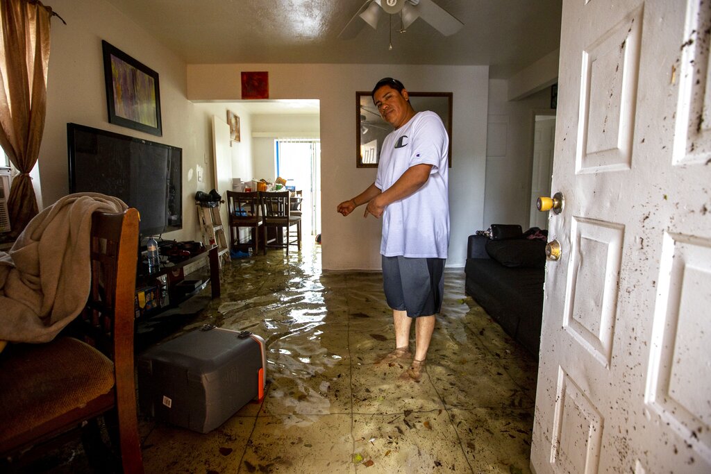 Olban Tremeneo Lagos, 42, points to the water inside his apartment off Southwest Third Street and Eighth Avenue in the Little Havana neighborhood of Miami, on Saturday, June 4, 2022. Parts of South Florida were experiencing road flooding from heavy rain and wind Saturday as a storm system that battered Mexico moved across the state. (Daniel A. Varela/Miami Herald via AP)
