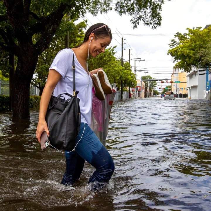A pedestrian moves through floodwater on Southwest Second Street in the Little Havana neighborhood of Miami, Saturday, June 4, 2022. (Daniel A. Varela/Miami Herald via AP)