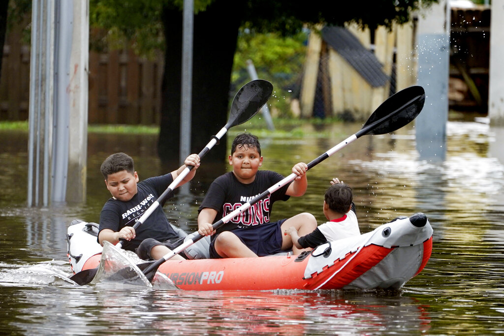 Young boys paddle an inflatable kayak on a flooded Miami street, Saturday, June 4, 2022. A tropical storm warning was in effect along portions of coastal Florida and the northwestern Bahamas. Several Miami streets were flooded and authorities were towing abandoned vehicles (AP Photo/Marta Lavandier)