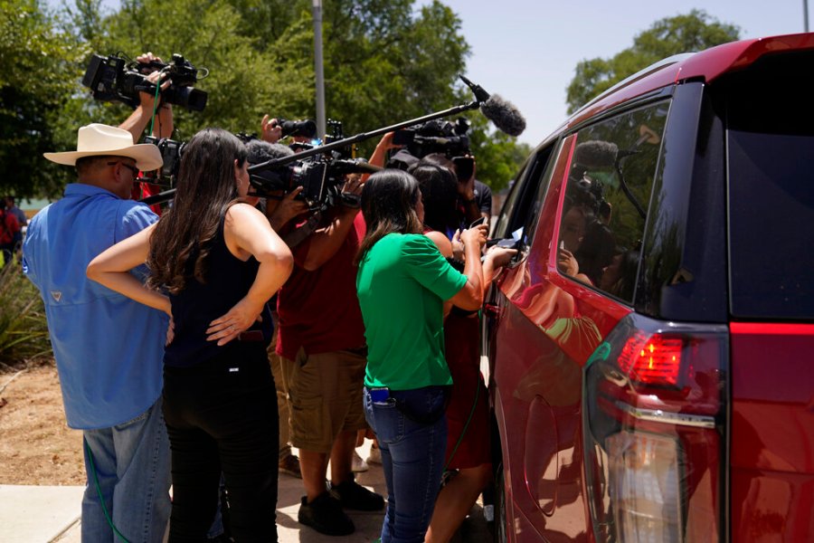 Media approach the parents and other family members of shooting victim Uziyah Garcia after they picked up a copy of the Texas House investigative committee report on the shootings at Robb Elementary School, Sunday, July 17, 2022, in Uvalde, Texas. (AP Photo/Eric Gay)