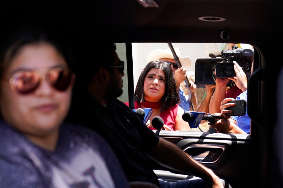 Crystal Garcia, left, and Sergio Garcia, center, stepmother and father of shooting victim Uziyah Garcia, talk to the media from the back of a vehicle after picking up a copy of the Texas House investigative committee report on the shootings at Robb Elementary School, Sunday, July 17, 2022, in Uvalde, Texas. (AP Photo/Eric Gay)