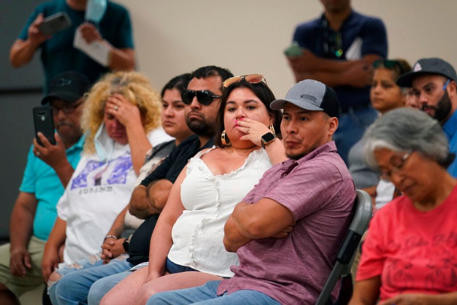 Family of shooting victims listen to the Texas House investigative committee release its full report on the shootings at Robb Elementary School, Sunday, July 17, 2022, in Uvalde, Texas. (AP Photo/Eric Gay)
