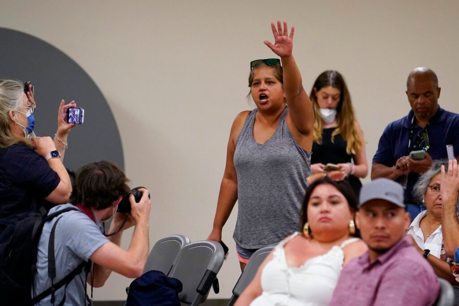 Residents and family of shooting victims listen to the Texas House investigative committee release its full report on the shootings at Robb Elementary School, Sunday, July 17, 2022, in Uvalde, Texas. (AP Photo/Eric Gay)