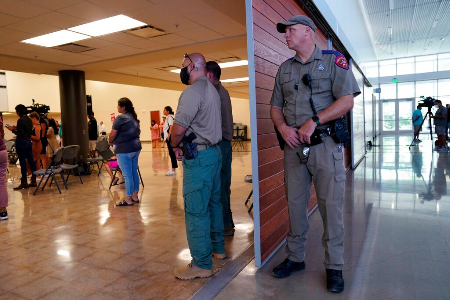A Texas State Trooper and other members of law enforcement listen to the Texas House investigative committee during a news conference after they released a full report on the shootings at Robb Elementary School, Sunday, July 17, 2022, in Uvalde, Texas. (AP Photo/Eric Gay)