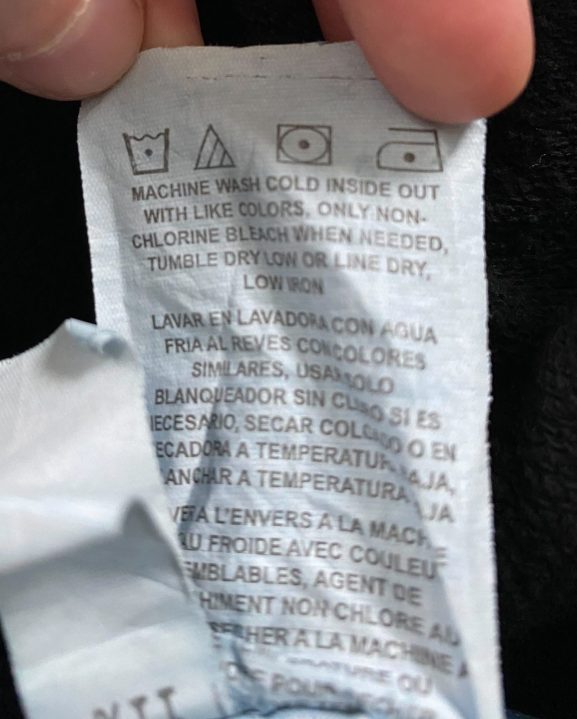 There are five elements the FTC outlines that need to be on the tag: whether the item should be washed by hand or by machine; if it can be treated with bleach; how it should be dried; how it should be ironed; and if there is a “care procedure that will harm the product.” These can be specific depending on the item, like the maximum temperature for a wash cycle, or omitted, if that specific care element won’t harm the product. You may also find dry cleaning instructions on a tag.