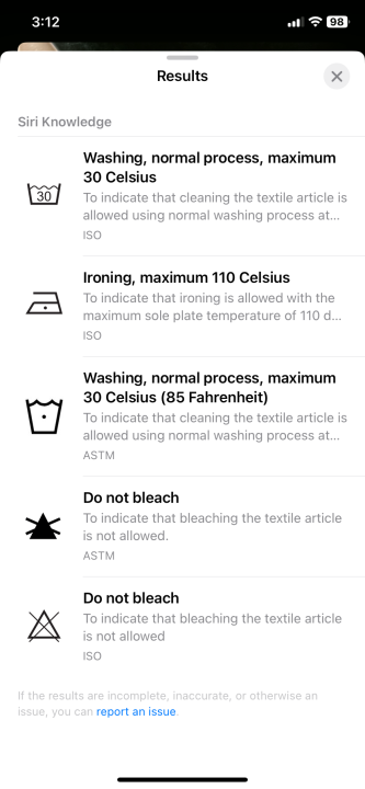 We tried the Visual Look Up feature on a few other items, including a Nike hooded sweatshirt (which had the same guidelines, as well as “do not dry clean” and “tumble dry” with a max temperature of 140 °F) and a pair of Levi jeans (wash normally with temperatures not exceeding 85 °F; “tumble dry” with a max temperature of 140 °F; iron at temperatures less than 230 °F; and bleach only with non-chlorine agents). However, the CEO of Levi may have a different suggestion.