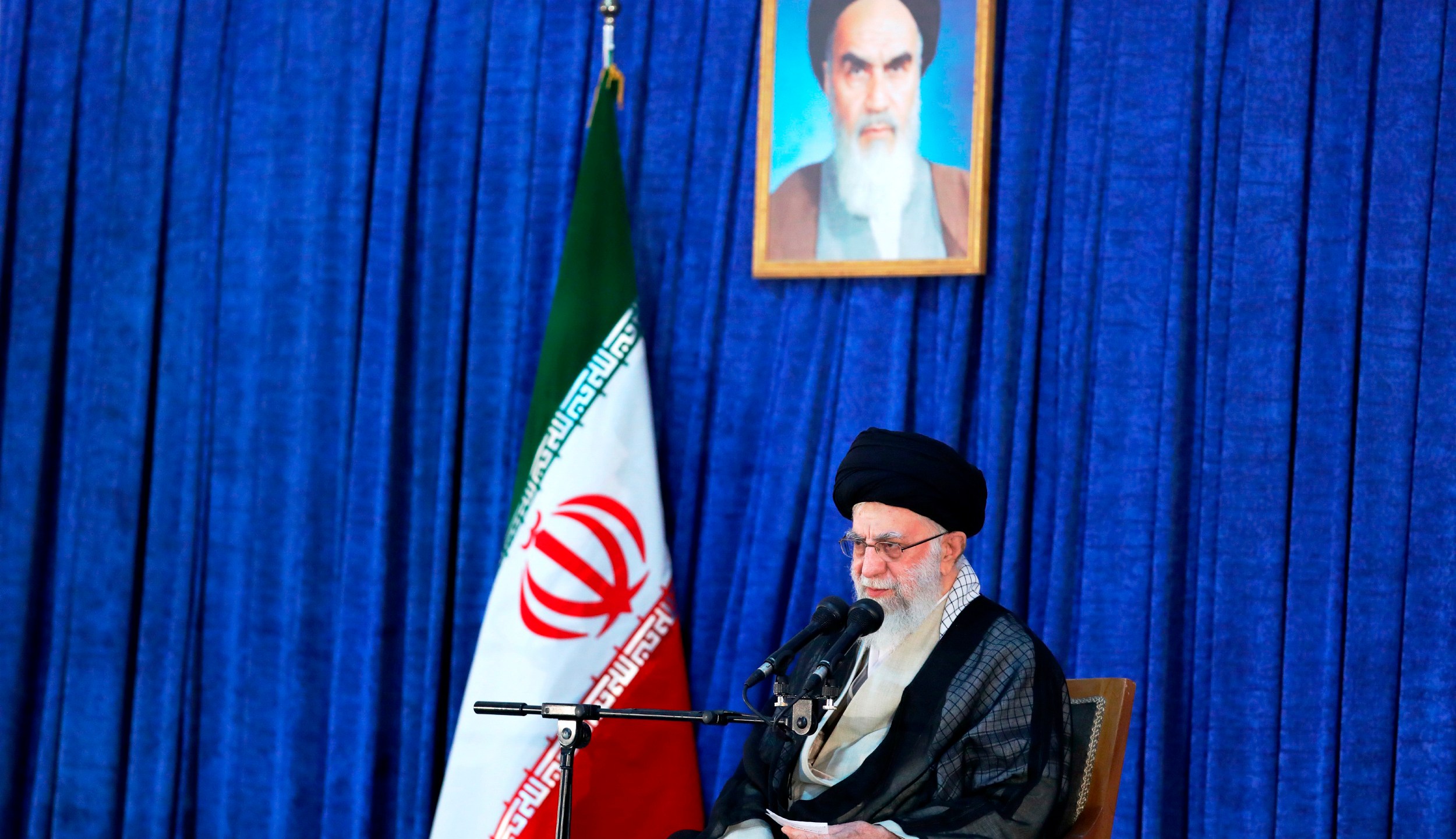 In this photo released by an official website of the office of the Iranian supreme leader, Supreme Leader Ayatollah Ali Khamenei speaks on the anniversary of the death of the late founder of the Islamic Republic, Ayatollah Ruhollah Khomeini, shown in the poster at top center, at his mausoleum in Tehran, Iran, Saturday, June 4, 2022. Khamenei acknowledged Saturday that Iran took the oil from two Greek tankers last month in helicopter-launched raids in the Persian Gulf. (Office of the Iranian Supreme Leader via AP)