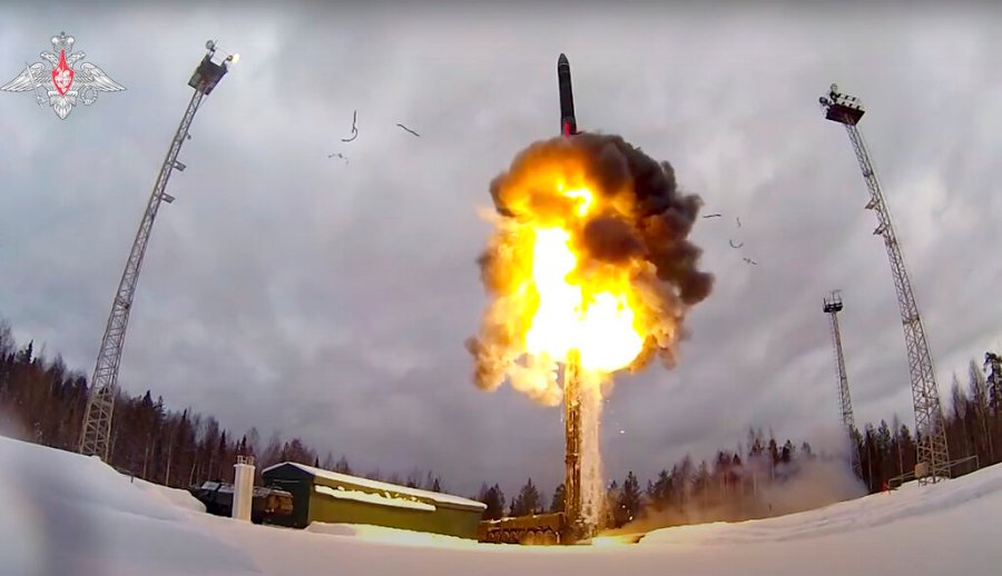 FILE – This photo, taken from video provided by the Russian Defense Ministry Press Service on Feb. 19, 2022, shows a Yars intercontinental ballistic missile being launched from an airfield during military drills. With his room for maneuver narrowing quickly amid Russian military defeats in Ukraine, Russian President Vladimir Putin has signaled that he could resort to nuclear weapons to protect the Russian gains in Ukraine — the harrowing rhetoric that shattered a mantra of stability he has repeated throughout his 22-year rule. (Russian Defense Ministry Press Service via AP, File)