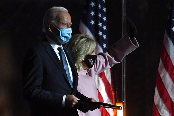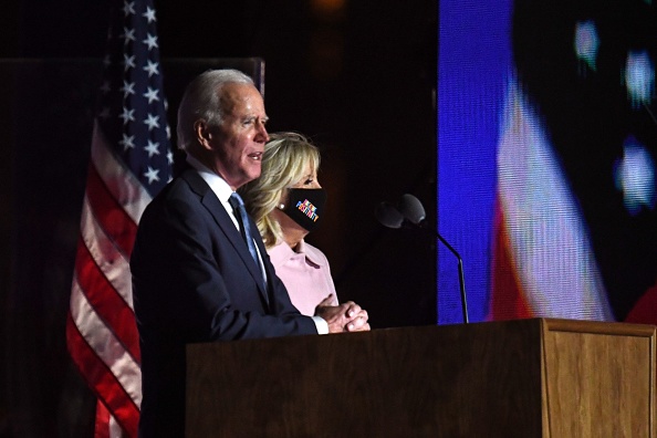 Democratic presidential nominee Joe Biden (L) stands with wife Jill Biden as he addresses supporters during election night at the Chase Center in Wilmington, Delaware, early on November 4, 2020. (Photo by Roberto SCHMIDT / AFP) (Photo by ROBERTO SCHMIDT/AFP via Getty Images)