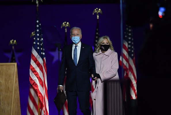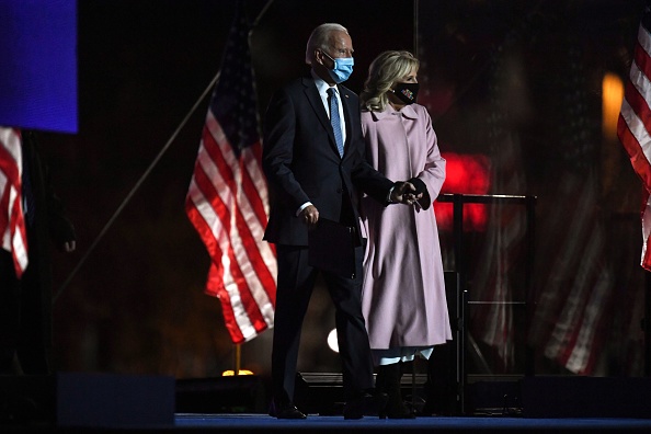 Democratic presidential nominee Joe Biden (L) and wife Jill Biden arrive onstage to address supporters during election night at the Chase Center in Wilmington, Delaware, early on November 4, 2020. (Photo by Roberto SCHMIDT / AFP) (Photo by ROBERTO SCHMIDT/AFP via Getty Images)