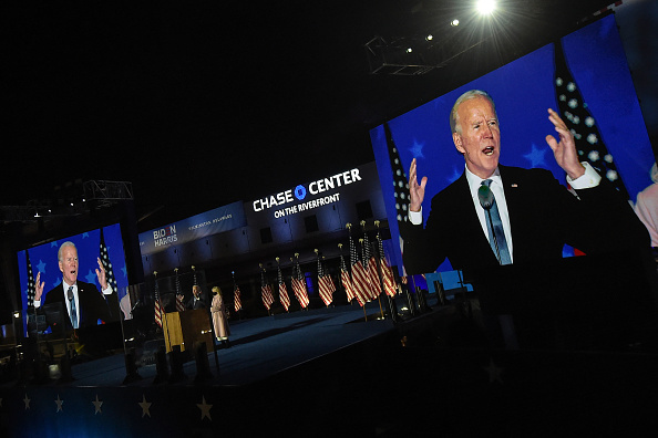 WILMINGTON, DELAWARE – NOVEMBER 04: Democratic presidential nominee Joe Biden speaks at a drive-in election night event as Dr. Jill Biden looks on at the Chase Center in the early morning hours of November 04, 2020 in Wilmington, Delaware. Biden spoke shortly after midnight with the presidential race against Donald Trump still too close to call. (Photo by Win McNamee/Getty Images)