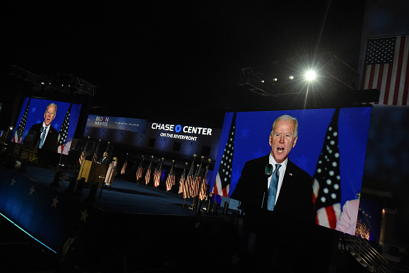 “We believe we are on track to win this election,” Biden told supporters in nationally broadcast remarks delivered in his home city of Wilmington, Delaware, adding: “It ain’t over until every vote is counted.” (Photo by ANGELA WEISS / AFP) (Photo by ANGELA WEISS/AFP via Getty Images)