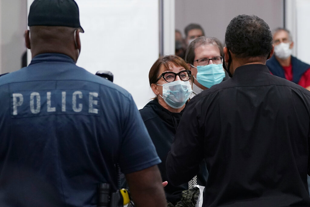 Video shot by local media showed angry people gathered outside the TCF Center and inside the lobby, with police officers lined up to keep them from entering the counting area. They chanted “Stop the count!” and “Stop the vote!”
