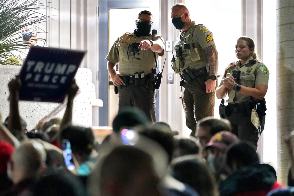 Several sheriff’s deputies blocked the entrance to the building. The vote-counting carried on into the night, Maricopa County Elections Department spokeswoman Megan Gilbertson said.