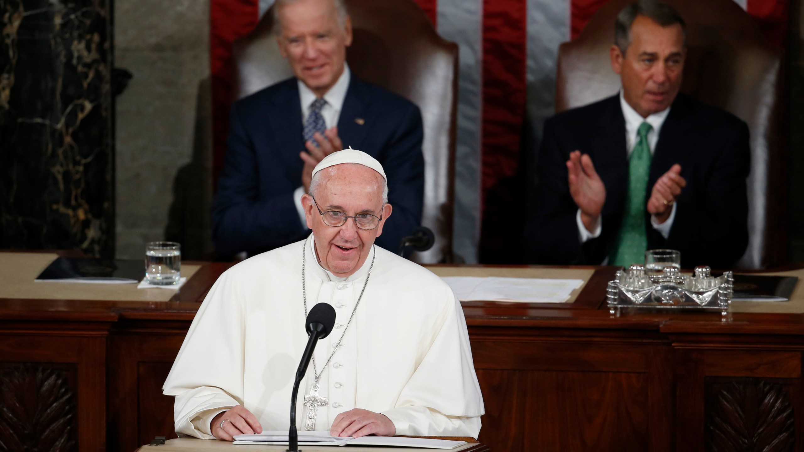 FILE – In this Thursday, Sept. 24, 2015 file photo, Pope Francis addresses a joint meeting of Congress on Capitol Hill in Washington, making history as the first pontiff to do so. Listening behind the pope are Vice President Joe Biden and House Speaker John Boehner of Ohio. President-elect Joe Biden, a lifelong Roman Catholic, spoke to Pope Francis on Thursday, Nov. 12, 2020, despite President Donald Trump refusing to concede. Trump claims — without evidence — that the election was stolen from him through massive but unspecified acts of fraud. (AP Photo/Carolyn Kaster)