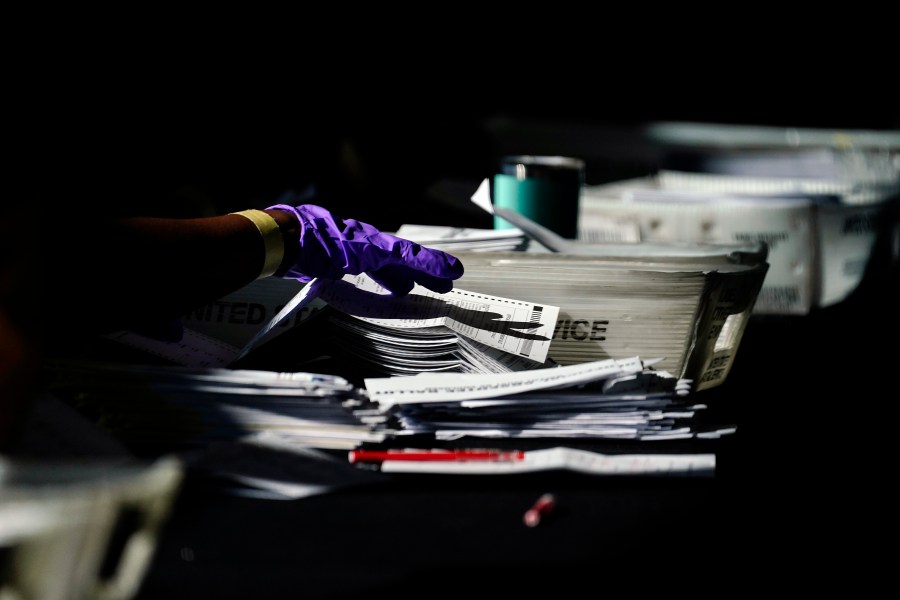Election personnel handle ballots as vote counting in the general election continues at State Farm Arena, Wednesday, Nov. 4, 2020, in Atlanta. (AP Photo/Brynn Anderson)