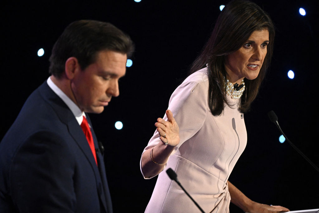 Former US Ambassador to the UN Nikki Haley (R) speaks as Florida Governor Ron DeSantis (L) looks down during the fifth Republican presidential primary debate at Drake University in Des Moines, Iowa, on January 10, 2024. (Photo by Jim WATSON / AFP) (Photo by JIM WATSON/AFP via Getty Images)
