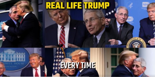 Screengrab of a presidential attack ad generated by the Ron DeSantis campaign featuring fake AI-generated images of former President Donald Trump and Dr. Anthony Fauci hugging. (Credit: DeSantis War Room via Twitter)