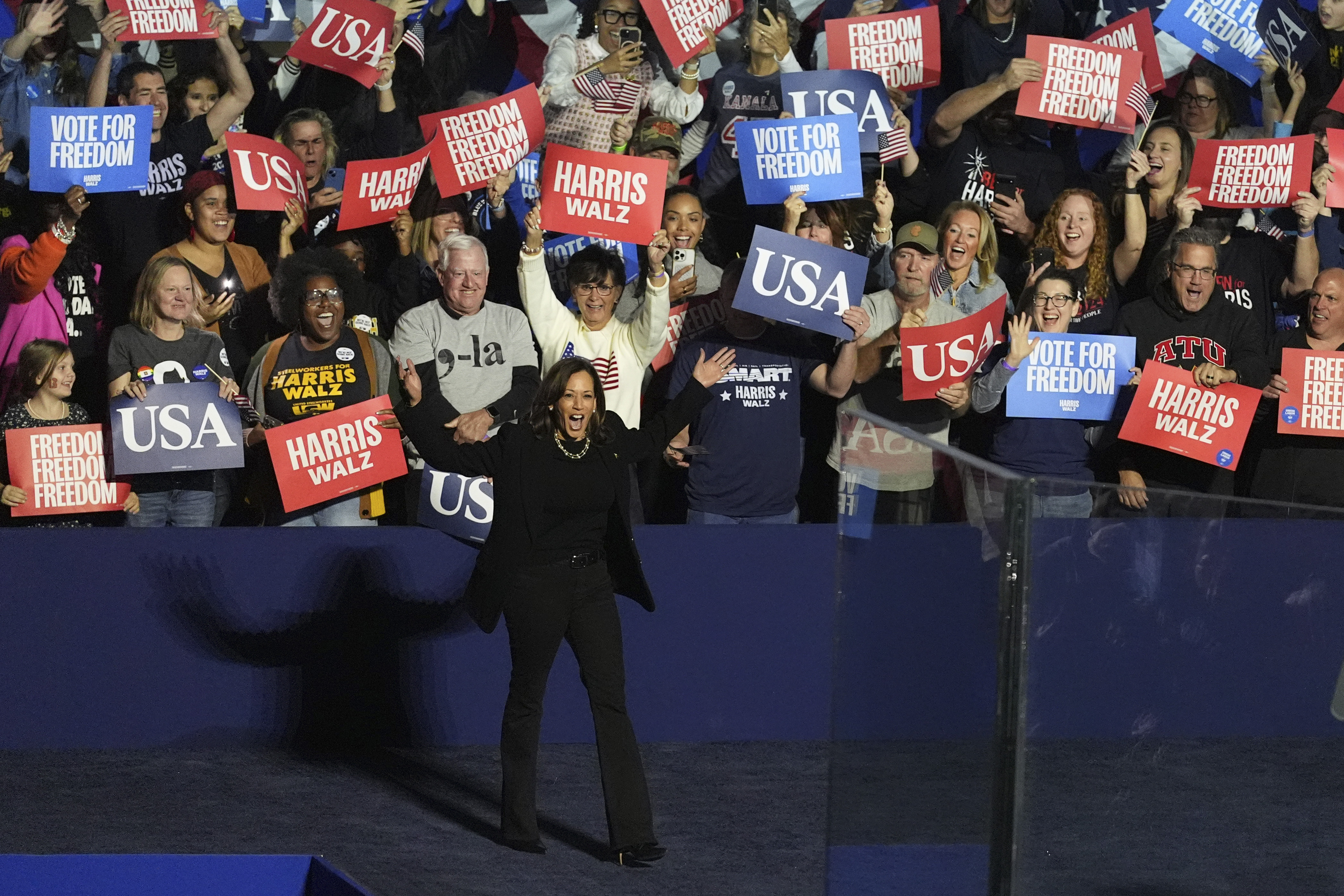 The campaign reported 2,500 attendees in the main room, with an additional 1,700 in overflow and approximately 2,000 unable to enter after the fire marshal closed the doors. Rallygoers held signs reading “A President for All” and “Vote for Freedom” and chanted, “We’re Not Going Back” and “Vote.”
