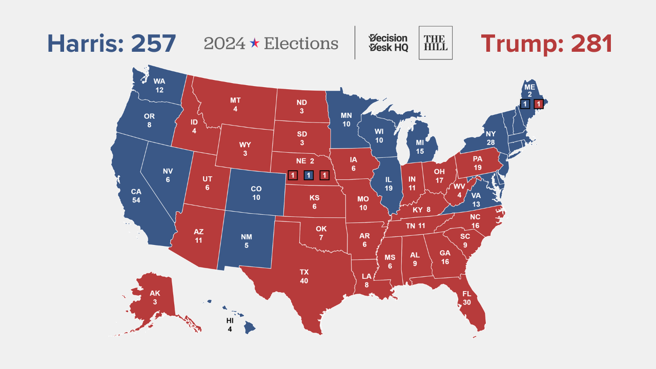 • Harris wins: Michigan, Nevada, Pennsylvania