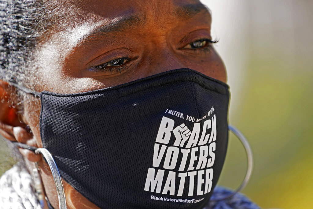 FILE – In this Nov. 2, 2020, file photo, Sharon Brown, co-chair of the Mississippi Poor Peoples Campaign, reacts during a news conference at the state Capitol in Jackson, Miss., over voting concerns statewide. Months of discussions about racial justice are being followed by change at the ballot box. (AP Photo/Rogelio V. Solis, File)