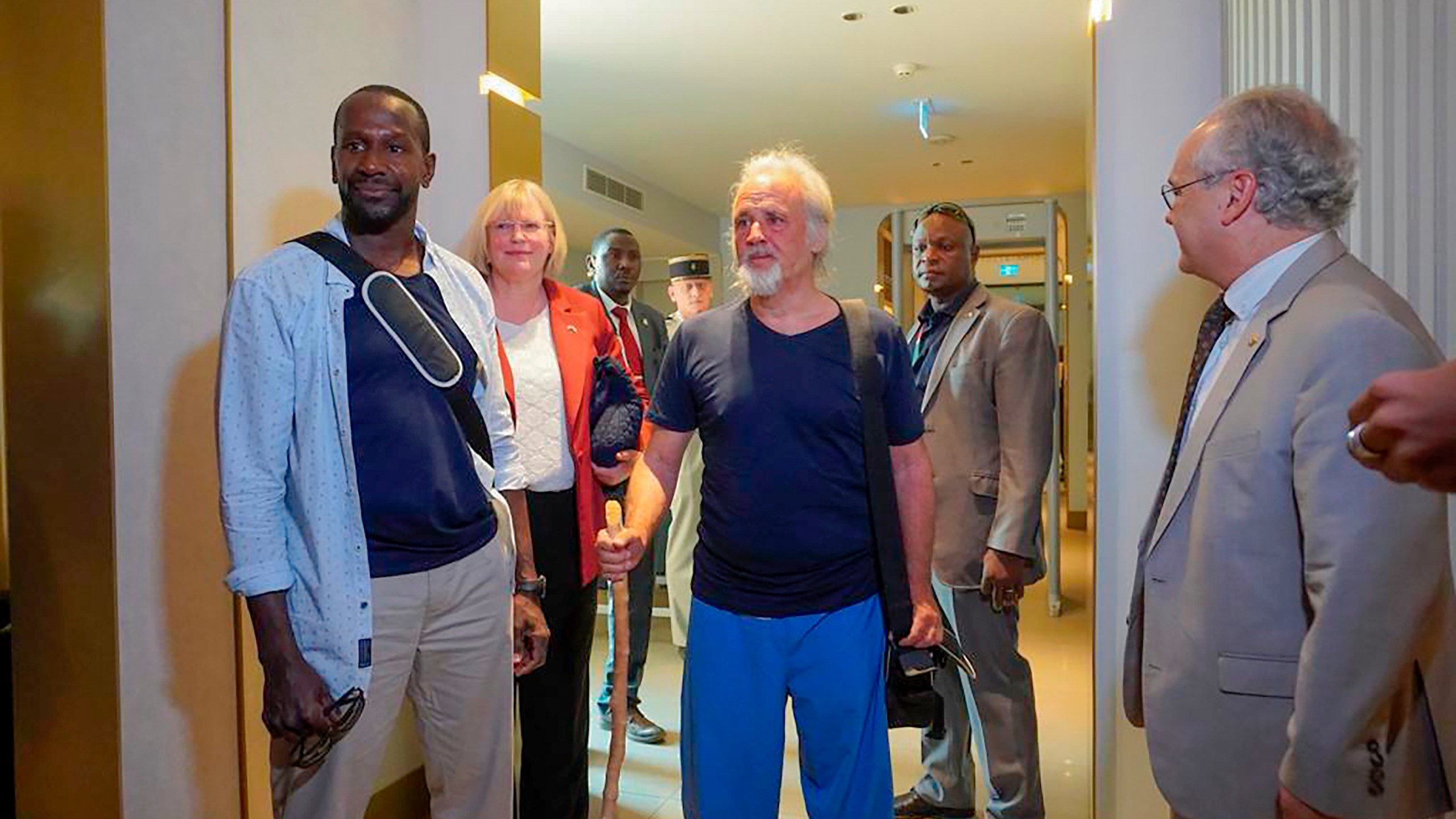 “I thank God first of all. And after God, I thank the government of Niger, the U.S. government and France. Long live France!” said Woodke, his long gray hair pulled back in a ponytail as he used a walking stick.