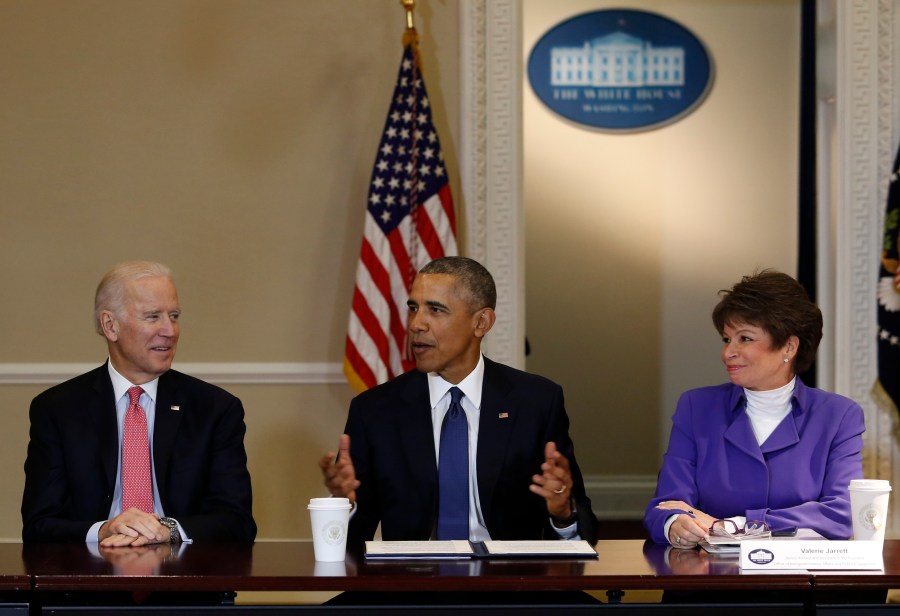 WASHINGTON, DC – FEBRUARY 19: President Barack Obama speaks during a meeting of the Democratic Governors Association while Vice President Joe Biden (3L) and Senior Advisor to the President Valerie Jarrett (2R) listen at the Eisenhower Executive Office Building at the White House on February 19, 2016 in Washington, DC. (Photo by Aude Guerrucci – Pool/Getty Images)