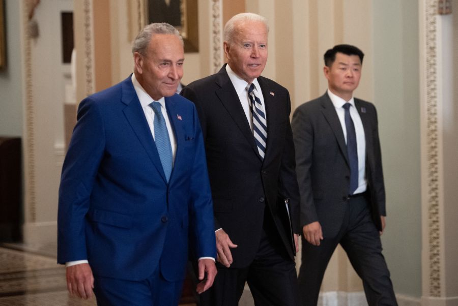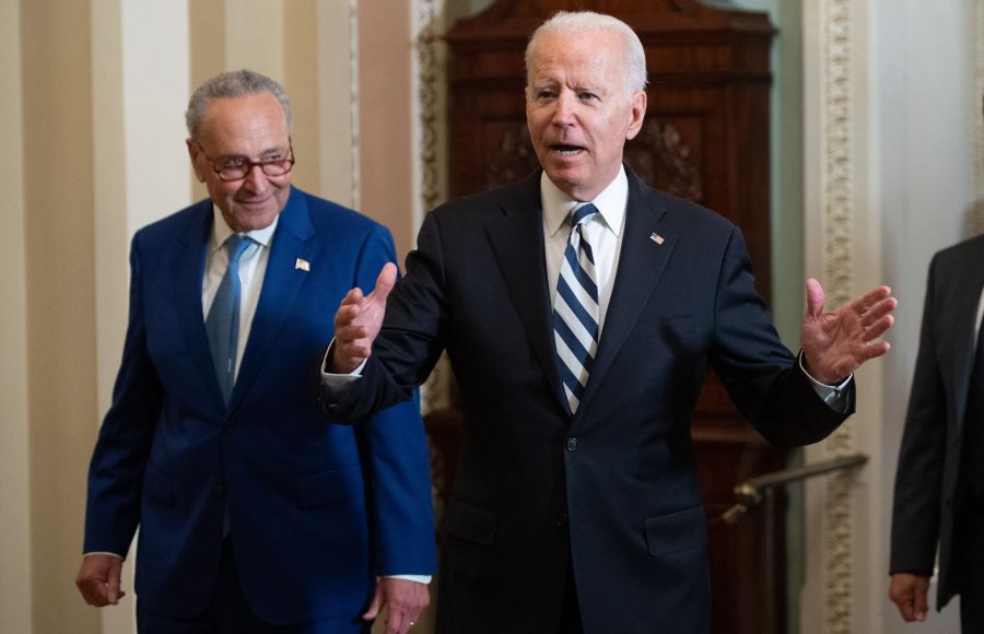 US President Joe Biden, with Senate Majority Leader Chuck Schumer (L), arrives to meet with the Senate Democratic caucus to build support for his infrastructure and economic investment goals during the Democratic luncheon at the US Capitol on July 13, 2021 in Washington, DC, July 14, 2021. – The meetings come as the president and his allies step on the accelerator in hopes of getting two huge spending packages passed within the next couple months. (Photo by SAUL LOEB / AFP) (Photo by SAUL LOEB/AFP via Getty Images)