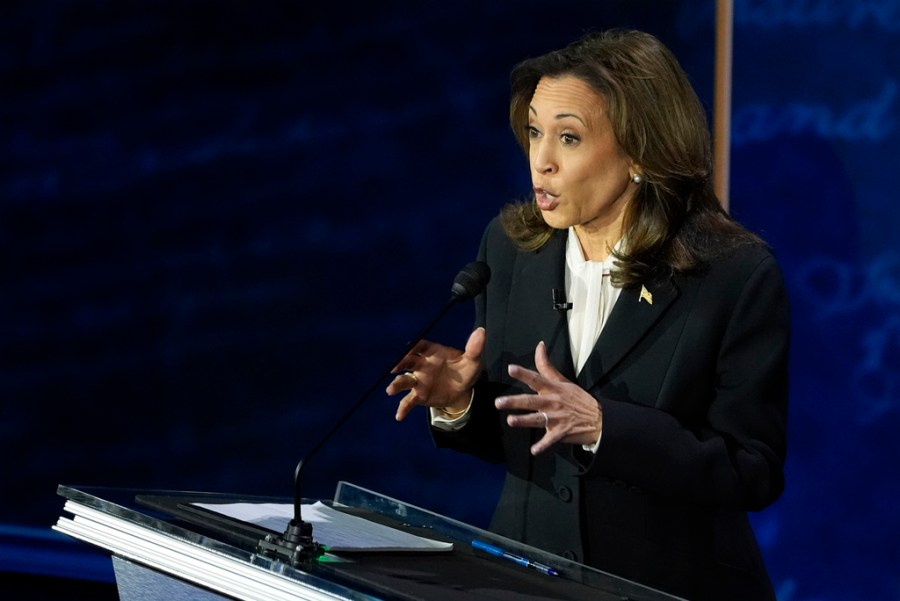 When asked about the Biden administration’s decision to keep some of Trump’s tariffs, Harris said Trump left the country with a trade deficit and accused Trump of selling the U.S. out when it comes to supplying computer chips that China used to update its military.