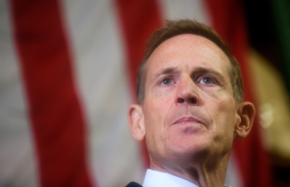 GREENSBORO, NC – OCTOBER 13: U.S. Senate candidate Rep. Ted Budd (R-NC) pauses during a campaign rally at Illuminating Technologies on October 13, 2022 in Greensboro, North Carolina. Rep. Budd, running against Democratic Senate candidate Cheri Beasley, was introduced by Donald Trump Jr. to a small crowd of supporters during the “Keep NC Red” rally. (Photo by Melissa Sue Gerrits/Getty Images)