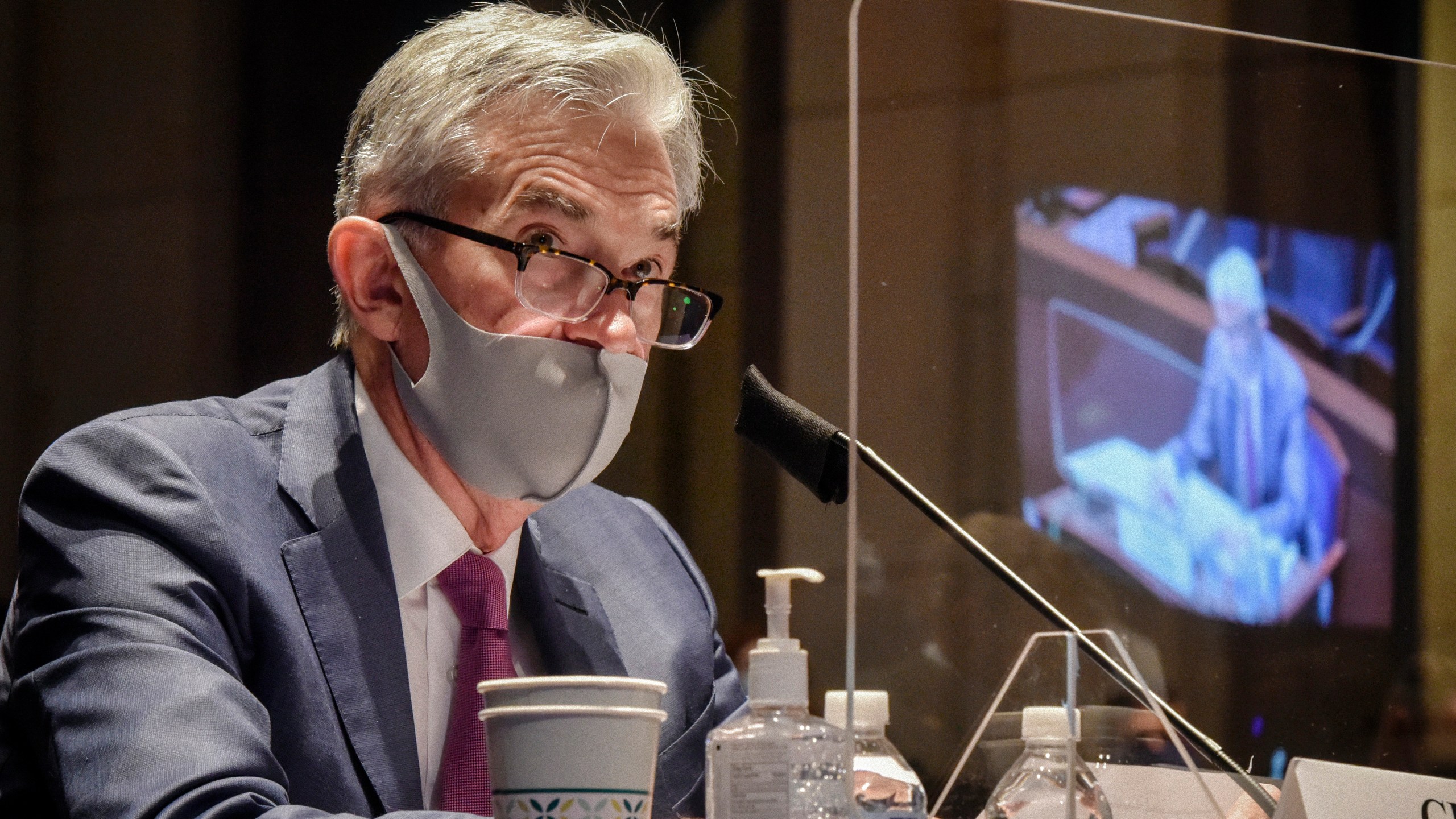 FILE – In this June 30, 2020, file photo Federal Reserve Board Chairman Jerome Powell, reflected in the sneeze guard set up between himself and members of the House Committee on Financial Services, speaks during a hearing on oversight of the Treasury Department and Federal Reserve pandemic response on Capitol Hill in Washington. (Bill O’Leary/The Washington Post via AP, Pool)