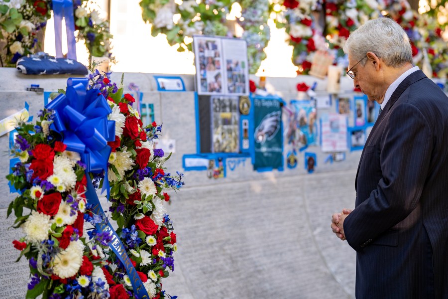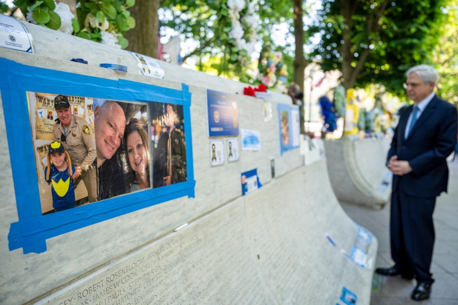 WASHINGTON, DC – MAY 13: U.S. Attorney General Merrick Garland looks at photographs, flowers, and mementos left for fallen officers as he visits the National Law Enforcement Officers Memorial to commemorate the start of Police Week on May 13, 2024 in Washington, DC. May 15th was proclaimed as Peace Officers Memorial Day and the week it falls in as Police Week by President John F. Kennedy decades ago, but what started with a small group in the early 1980s has grown to thousands gathering annually in Washington, DC to reflect, honor and support police officers. (Photo by Andrew Harnik/Getty Images)