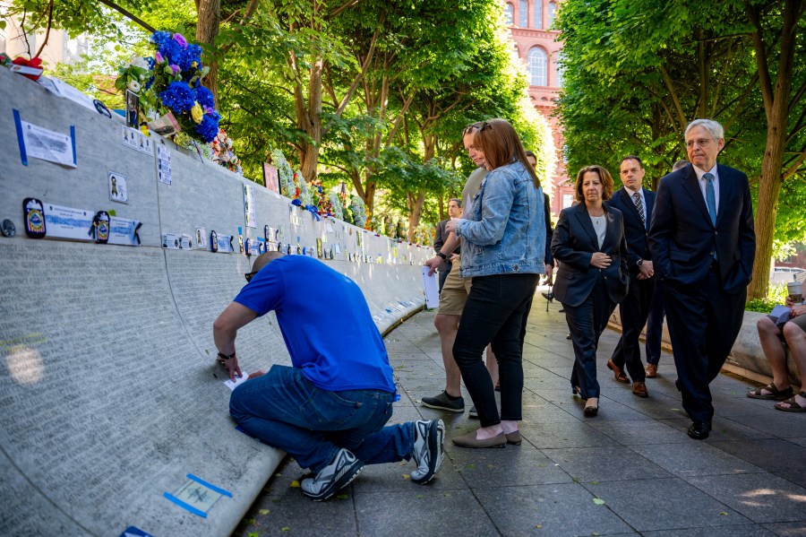 WASHINGTON, DC – MAY 13: U.S. Attorney General Merrick Garland (C) and Acting Associate Attorney General Benjamin Mizer (L) visit the National Law Enforcement Officers Memorial to commemorate the start of Police Week on May 13, 2024 in Washington, DC. May 15th was proclaimed as Peace Officers Memorial Day and the week it falls in as Police Week by President John F. Kennedy decades ago, but what started with a small group in the early 1980s has grown to thousands gathering annually in Washington, DC to reflect, honor and support police officers. (Photo by Andrew Harnik/Getty Images)