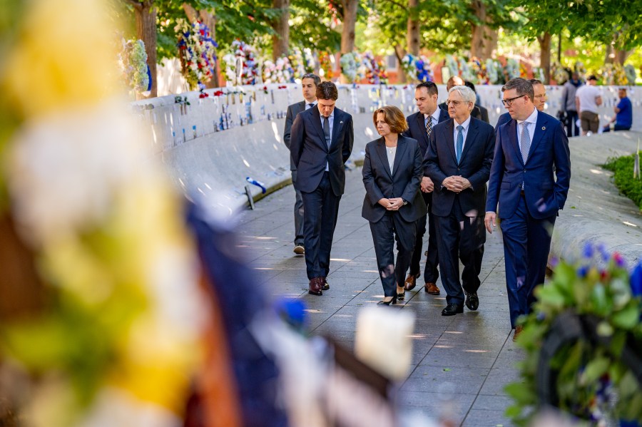 WASHINGTON, DC – MAY 13: (R-L)U.S. Attorney General Merrick Garland, Acting Associate Attorney General Benjamin Mizer, and Deputy Attorney General Lisa Monaco visit the National Law Enforcement Officers Memorial to commemorate the start of Police Week on May 13, 2024 in Washington, DC. May 15th was proclaimed as Peace Officers Memorial Day and the week it falls in as Police Week by President John F. Kennedy decades ago, but what started with a small group in the early 1980s has grown to thousands gathering annually in Washington, DC to reflect, honor and support police officers. (Photo by Andrew Harnik/Getty Images)